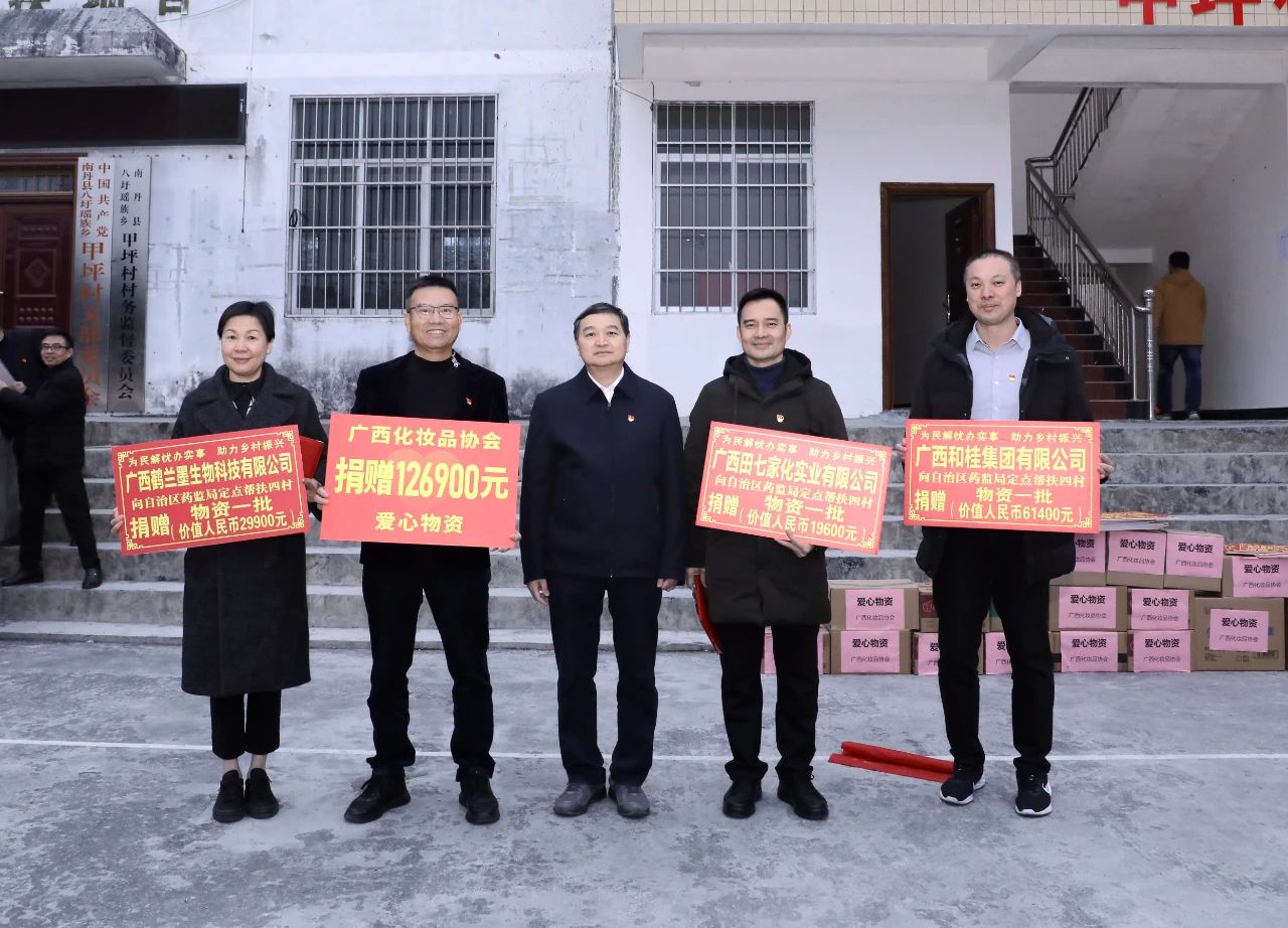接下來,在甲坪村舉行自治區(qū)藥監(jiān)局“黨旗領航·鑄牢中華民族共同體意識·攜手愛心社會組織和企業(yè)助力鄉(xiāng)村振興”幫扶十年成果展和捐贈活動,廣西和桂集團有限公司捐贈物資價值61400元。