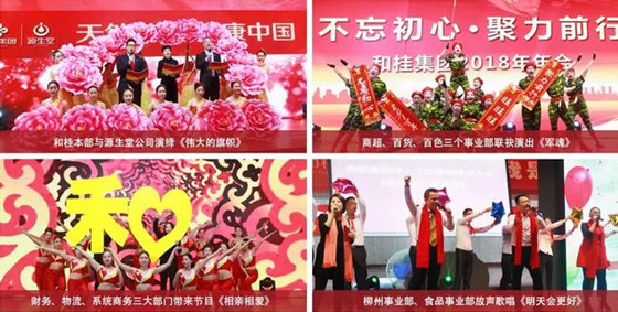 和桂集團本部及源生堂來來的開場舞《偉大旗幟》氣勢恢宏,源生堂人抱著堅定的信心,凝聚磅礴的力量,一起迎接養(yǎng)發(fā)新時代;財務(wù)+系統(tǒng)+物流帶來的舞蹈《相親相愛》展現(xiàn)了和桂大家庭的和諧與溫情??乒鹕坛?百貨+百色舞蹈《軍魂》,跳出了和桂人鋼鐵般堅韌的軍人意志力和軍魂。怡桂+食品《明天會更好》表達了全體員工“共創(chuàng)和桂輝煌明天”的美好愿望。