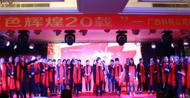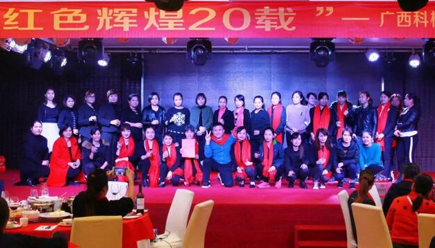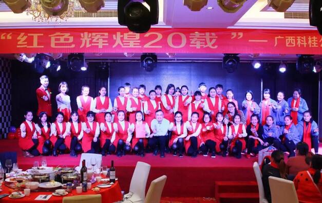 本次年會最大這點(diǎn)是主題以《紅色輝煌20年》講述的是廣西科桂貿(mào)易有限責(zé)任公司是在1998年的6月28日在南寧市桃源路上成立,到今年,剛好20年大慶。本次年會以紅色系為主,所有參會人員從穿衣到裝飾上都可謂是從頭火到腳,寓意我們生意紅紅火火,家庭美美滿滿。