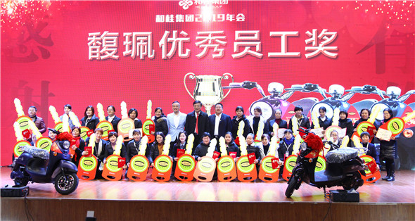 (廣東雅娜集團(tuán)有限公司總裁呂在坤和集團(tuán)常委頒發(fā)年度“馥珮”優(yōu)秀員工獎(jiǎng),每人一輛電動(dòng)車)