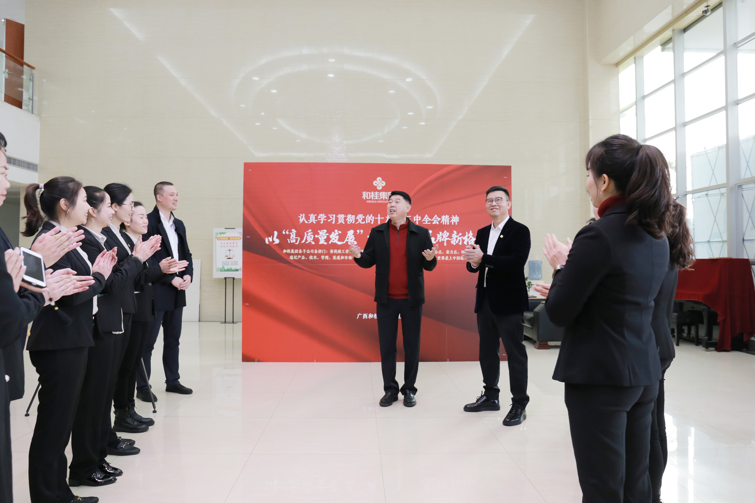 南寧市委統(tǒng)戰(zhàn)部副部長、市工商聯(lián)黨組書記李忠南,認(rèn)真?zhèn)鬟_(dá)了黨的十九屆五中全會精神,號召大家學(xué)習(xí)勞模精神、工匠精神,做新時期的奮斗者。通過生動的視頻和案例,特別是外籍人士對中國的認(rèn)識,以及對戰(zhàn)斗英雄、國家功勛李延年故事的講述,讓大家感受到幸福來之不易,紛紛表示要做愛國敬業(yè)、守法經(jīng)營、創(chuàng)業(yè)創(chuàng)新和回報社會的先鋒。同時,肯定了和桂集團(tuán)作為民營企業(yè),堅定信念,跟黨走,聽黨話,以高質(zhì)量發(fā)展,開創(chuàng)民族品牌新格局。